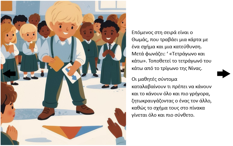 Για παράδειγμα, στο “Μπορώ να δημιουργήσω σύνθετα σχήματα!”, οι χαρακτήρες συνεργάζονται για να τοποθετήσουν σχήματα σε έναν καμβά ακολουθώντας συγκεκριμένες οδηγίες. Αυτή η δραστηριότητα όχι μόνο διδάσκει στους αναγνώστες τις πλευρές και τις άκρες, αλλά ενθαρρύνει επίσης την ομαδική εργασία και την επικοινωνία, καθώς η ιστορία τους οδηγεί μέσα από την οικοδόμηση ενός σύνθετου σχήματος συλλογικά. Ομοίως, σε άλλα ηλεκτρονικά βιβλία, οι χαρακτήρες συζητούν και επιλύουν προβλήματα μαζί, όπως το να καταλάβουν πώς να φτιάξουν μια σταθερή δομή χρησιμοποιώντας διαφορετικά σχήματα ή πώς να προσθέσουν τα ποσά σε έναν πίνακα κουτσό. Ομαδικές δραστηριότητες όπως αυτές αντικατοπτρίζουν σενάρια πραγματικής ζωής, όπου η συνεργατική επίλυση προβλημάτων είναι ένα ουσιαστικό βήμα για τη σχέση με τους συνομηλίκους και τη βελτίωση των οριζόντιων- επικοινωνιακών- δεξιοτήτων, προετοιμάζοντας έτσι τους αναγνώστες για παρόμοιες προκλήσεις που μπορεί να συναντήσουν, μέσα και έξω από την τάξη.