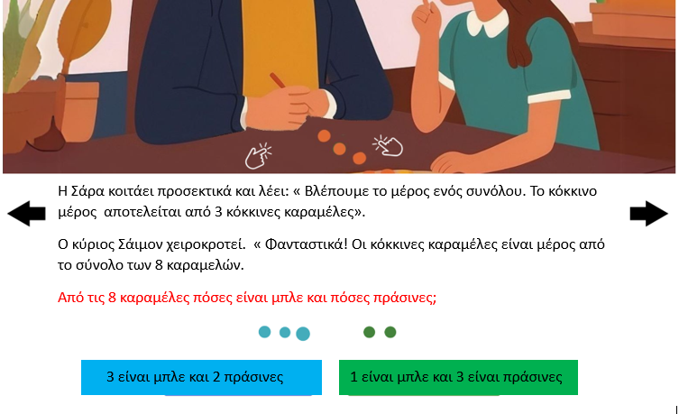 Κάθε ένα από τα ηλεκτρονικά βιβλία μας βυθίζει τους μαθητές σε μια αφήγηση όπου αναλαμβάνουν διαφορετικούς ρόλους, όπως ενεργώντας ως αρχιτέκτονες για να χτίσουν μια φουτουριστική πόλη. Πλαίσια όπως αυτά, βοηθούν τα παιδιά να δουν τις πρακτικές εφαρμογές της γεωμετρίας στην πραγματική ζωή. Κατασκευάζοντας κτίρια, χρησιμοποιώντας πολύγωνα και πολύεδρα, οι μαθητές μπορούν να αρχίσουν να κατανοούν τη συνάφεια των μαθηματικών στις καθημερινές δραστηριότητες και τα μελλοντικά επαγγέλματα. Σε άλλες ιστορίες, οι χαρακτήρες χρησιμοποιούν και εφαρμόζουν οικεία αντικείμενα και δραστηριότητες για να απεικονίσουν ένα σχετικό πλαίσιο, όπως η χρήση καραμελών για την εκμάθηση κλασμάτων. Αυτή η αφήγηση κάνει την αφηρημένη έννοια των κλασμάτων πιο απτή, συνδέοντάς την με κάτι οικείο και ευχάριστο για παιδιά. Με τη διάσπαση των καραμελών σε μέρη και σύνολα, οι αναγνώστες μπορούν να δουν οπτικά και φυσικά τα κλάσματα, απλοποιώντας ένα θέμα που αρχικά μπορεί να φαινόταν τρομακτικό.