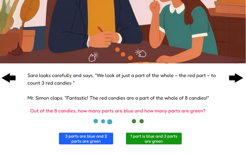Tous les livres numériques contiennent également des éléments musicaux afin d’aider les apprenants à mieux identifier les intrigues importantes de l’histoire ou simplement pour créer une atmosphère attrayante et agréable pour l’apprentissage. En permettant aux enfants d’interagir avec l’histoire par le biais d’actions et de clics, notre objectif était d’aider les apprenants (en particulier ceux qui luttent contre la « phobie des maths ») à mieux comprendre et apprécier les différents concepts mathématiques.