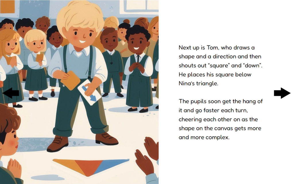Par exemple, dans « Je peux construire des formes complexes ! », les personnages travaillent ensemble pour placer des formes sur un canevas en suivant des consignes spécifiques. Cette activité n’apprend pas seulement aux lecteurs ce que sont les côtés et les arêtes, mais elle favorise également le travail d’équipe et la communication, puisque l’histoire les conduit à construire collectivement une forme complexe. De même, dans d’autres livres numériques, les personnages discutent et résolvent des problèmes ensemble, par exemple en déterminant comment construire une structure stable à l’aide de différentes formes ou comment additionner les sommes sur une marelle. Ces activités de groupe illustrent des scénarios de la vie réelle, où la résolution collaborative de problèmes est une étape essentielle de la relation avec les pairs et de l’amélioration des compétences non techniques. De cette manière, les lecteurs sont prêts à relever des défis similaires en classe et dans la vie de tous les jours.